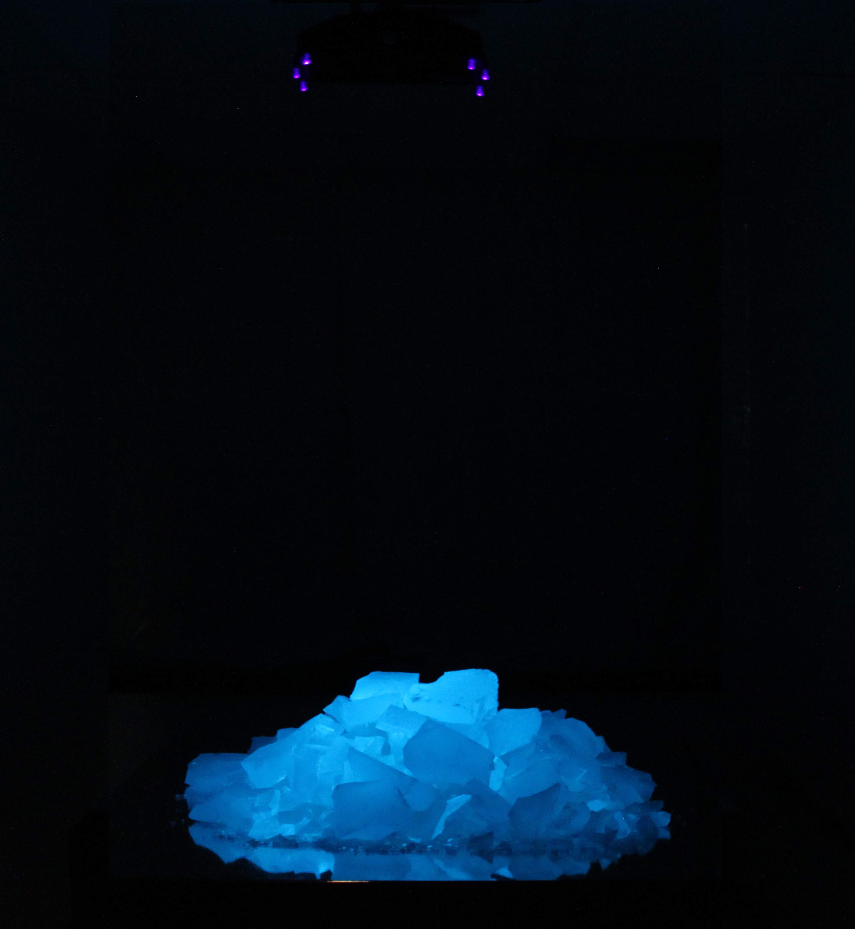 Dreamscape Concrète is a sound and light installation which physically consists of 25kg of blue phosphorescent polyester resin broken down into pieces. An 'HSS' hypersonic speaker rigged with UV LEDS hangs mounted overhead reflecting 15khz of fm tones off the multiple flat surfaces of the rubble. The result is a fizzing sensation emerging from the rocks and creates and auditory illusion while you walk around the work. The work as it names suggests attempts at a Concrete Dreamscape, a synthesis of Sun-Ra and Piere Schaeffer through the sci-fi futurism/folk culture of Detroit techno's sonic fiction. The work has been on display at The London College of Communication as well as recently the Science Museum as a part of 'Living Machines', an exhibition on biomimetics.