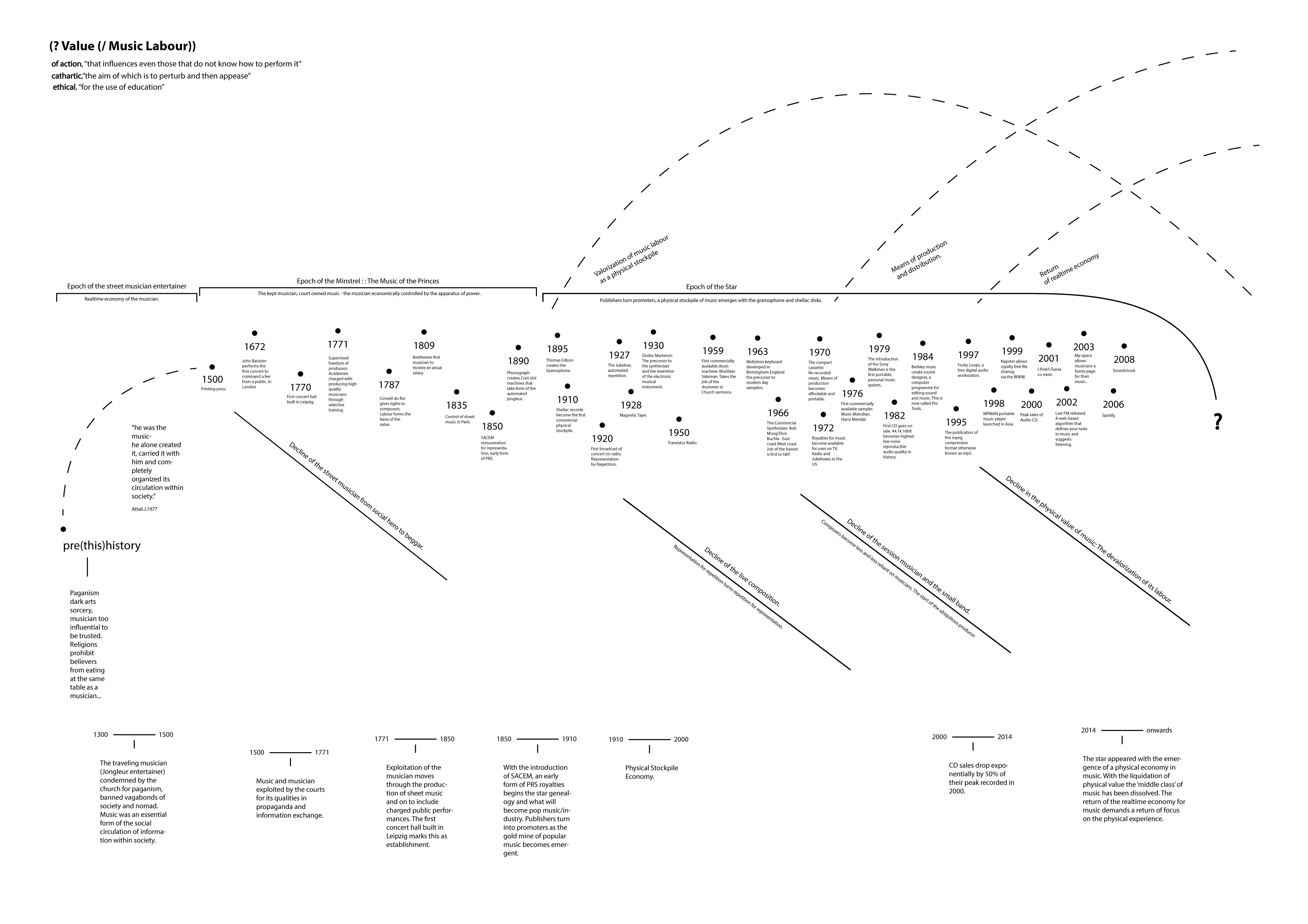This wall diagram was the result of a week long residency at the Swiss Pavilion of the Venice Biennale for Architecture in 2015 named the School of Tomorrow and curated by Hans Ulrich Obrist. The timeline maps the valorisation to de-valourization of labour within music using the book Noise (Attali.J.1977) as its main source. Download pdf.
